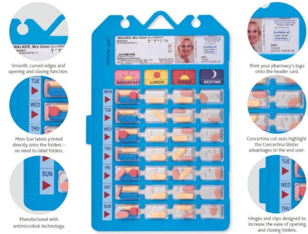 Webster packs: These are great if you want to see all of your pills at a glance. You can easily see if you have taken pills and can also see your Medication Chart.