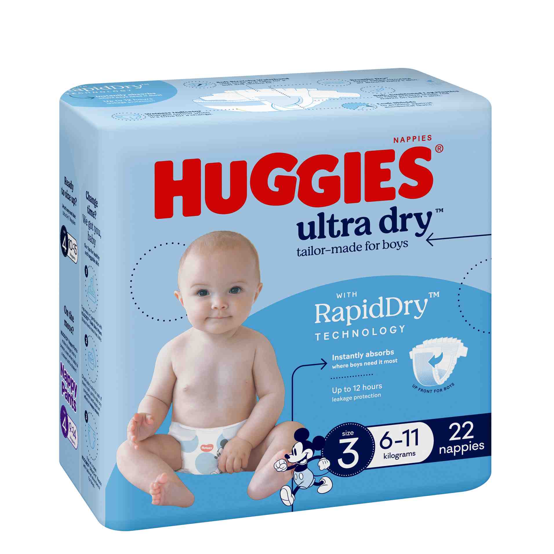 Huggies Ultra Dry Nappies with tailor-made absorbency up front for boys. Huggies unique Rapid-Dry Technology instantly absorbs wetness and springs back dry in seconds. Keeping baby snug & dry, day & night with up to 12hrs leakage protection.